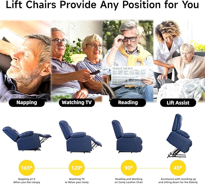 - 【Adjustable to Any Position】Power Lift Recliner Adjust to Any Angle You Need(45°-165°), Our lift chairs are equipped with a lift remote control, which Avoids the issue of not being able to reach the lift button on the armrest when lying down. Additionally, Based on SGS testing, Button replacing the remote control resulted in a 72% decrease in chair malfunction rates.