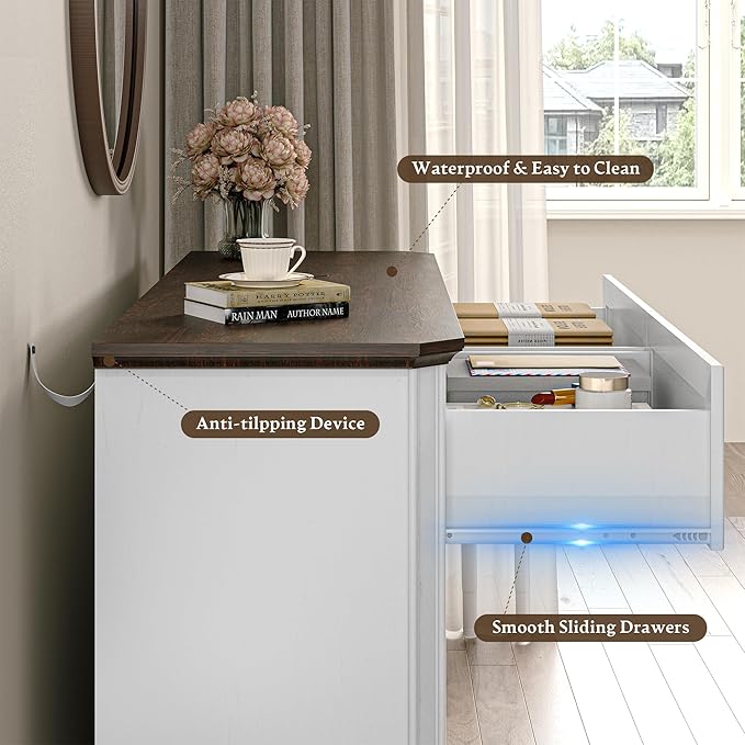 - 【Solid Material & Study Construction】The dressers & chests of drawers are constructed from optimal MDF, P2 engineered wood and coated metal handle which not only has exquisite texture, but also ensure long-term use, scratch resistant and no strong odor. Each drawer holds up to 35 lbs/15 lbs and the thickened tabletop can support up to 150 lbs. For easy cleaning, just wipe with damp cloth and get it air-dried