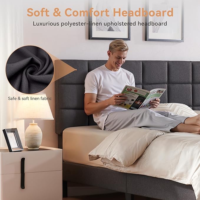 - STABLE & NOISE FREE:Enjoy peaceful nights with our queen size bed frame, featuring non-slip strips that securely hold your mattress in place. Say goodbye to noise and hello to restful sleep. Ideal for any bedroom, our queen size bed frames with headboard offer both style and stability.