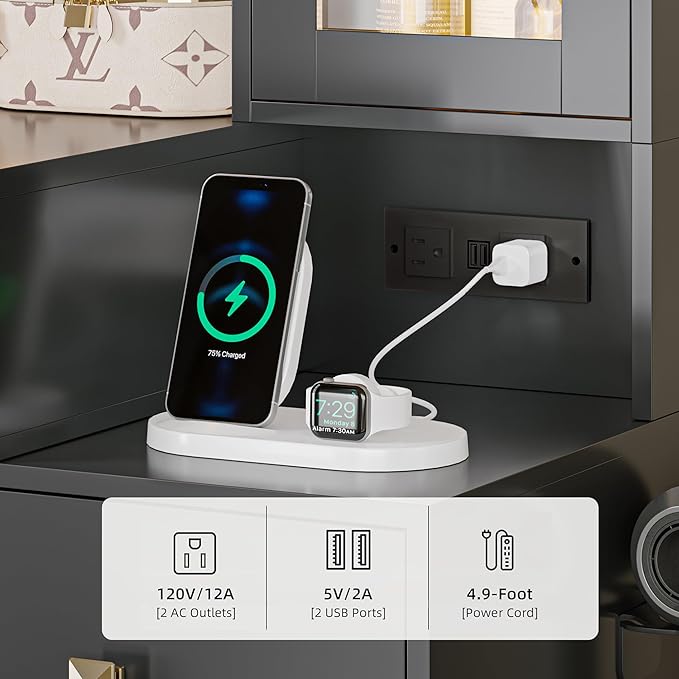 - 【VANITY WITH CHARGING STATION】Charging is no longer a problem! The vanity mirror with lights desk and chair features the built-in power strip with 2 outlets and 2 USB ports, so you can use the hair dryer or curling iron while sitting in front of white vanity, also can charge your phone or other mobile devices while putting on makeup. Everything is within your reach.