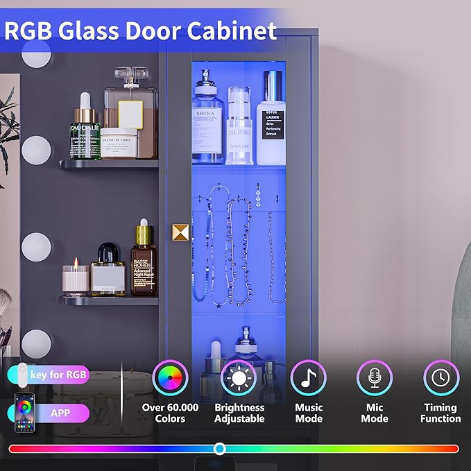- 【GLASS CABINET WITH RGB LED LIGHTS】The makeup vanity is equipped with 3-layer glass display cabinet, and there is RGB LED light on the cabinet top, which can be controlled via APP or the switch. With multiple dynamic modes, such as music mode, microphone mode and timing function. You can change LED light flashing with the rhythm of music. Behind the cabinet of vanity mirror with lights, hidden jewelry racks can be used to store your rings, necklaces and earrings, making your jewelry look organized.
