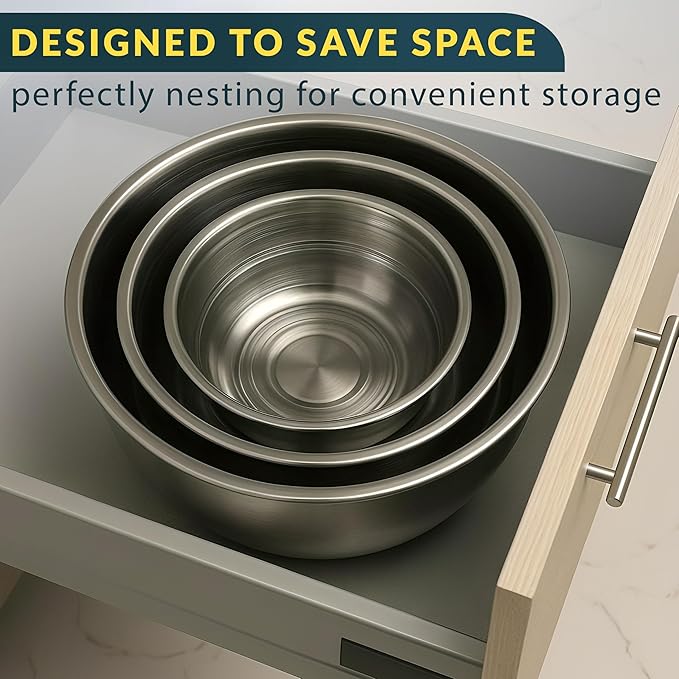 - SMART NESTING SAVES SPACE: These silver mixing bowl stack neatly into one another for efficient storage. Each stainless steel mixing bowl lid set is BPA-free and helps keep food fresh longer in your fridge.