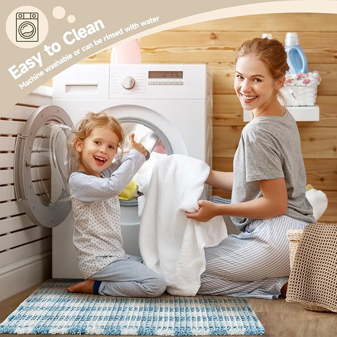 Waffle Bath Mat, Boho Bathroom Rugs Non Slip Washable Absorbent Checkered Bathroom Mat Quick Dry Cute Bath Mat, 48"x24" Blue and White