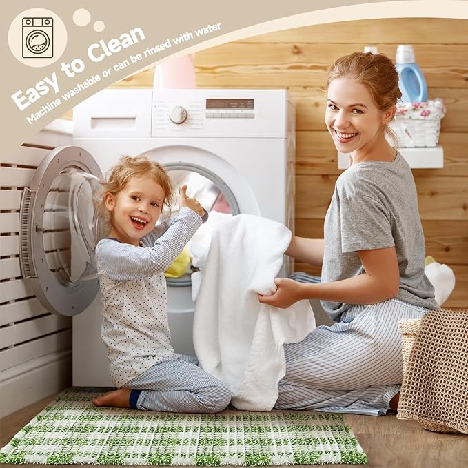 Waffle Bath Mat, Boho Bathroom Rugs Non Slip Washable Absorbent Checkered Bathroom Mat Quick Dry Cute Bath Mat, 30"x20" Green and White