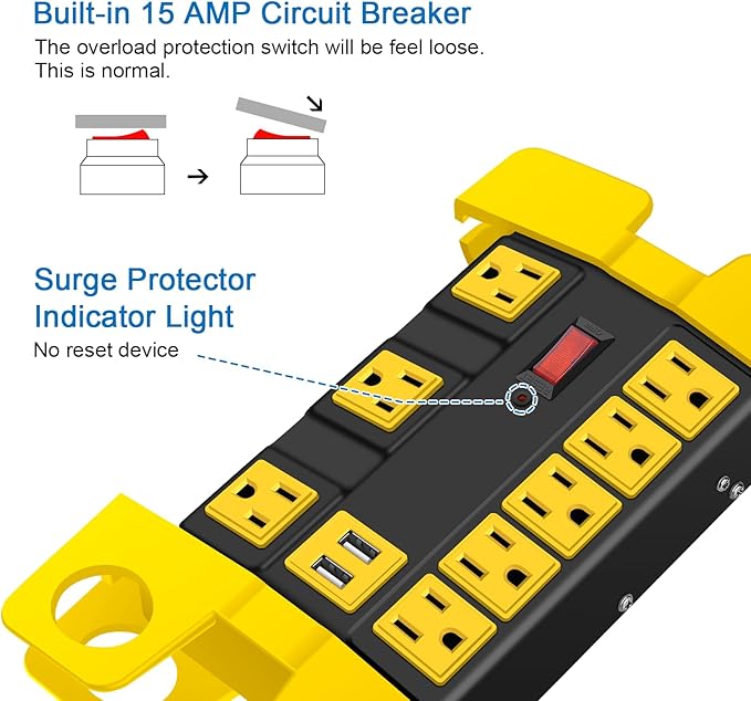 - Workshop 8 outlets power strip surge protector 2700J enough for larger surges, with 15FT 14AWG/3C power cord. The cord wrap velcro design for organize cable.