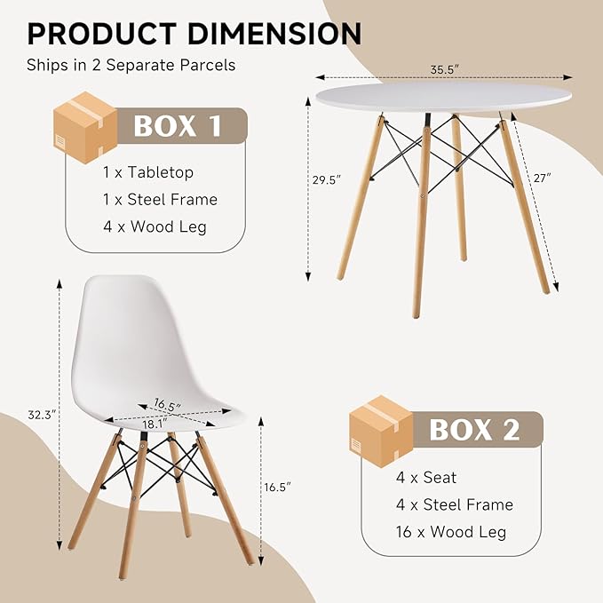 35.5'' 5 Piece Round Dining Table Set for 4, Mid-Century Modern Table with Chairs, Space Saving, Plastic Seats, Wood Legs, Circle Dinner Table for Kitchen, Home, Apartment, White