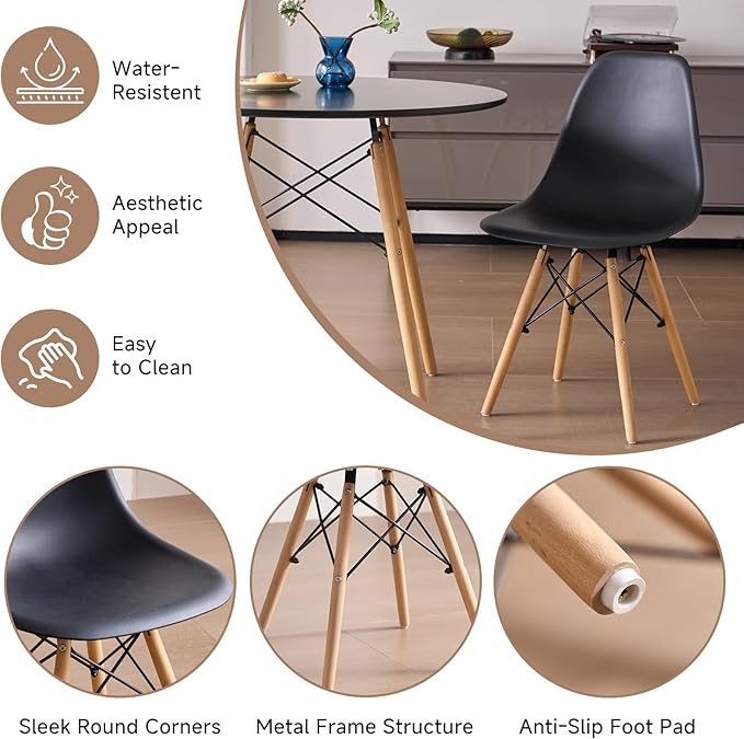 - Durable and Sturdy Construction - The round dining table with 4 chairs set is constructed with high-strength plastic seats, wooden legs, and a metal frame. Non-slip pads on the chair feet of the table and chairs set of 4 protect floors. The durable MDF tabletop and quality plastic seats of the round table rest on solid beech wood legs held sturdy with metal wire for long-lasting stability.