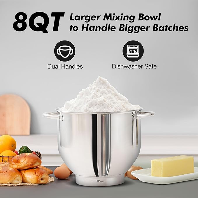 - 8QT Large Capacity Bowl With Handles - 8QT Stainless steel bowl can meet all your kitchen needs. The Stand Mixer is easy to use for making cakes, breads, cookies, pastry, muffins and waffle, and the dual handles are more convenient to hold.