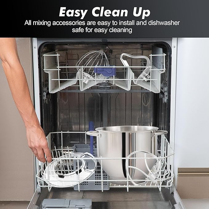 - Multiple Attachment Set - Aucma stand mixer comes with three upgraded mixing accessories: whisk, dough hook, mixing beater which are all dishwasher safe.The splash guard with access hatch helps add ingredients without making a mess.
