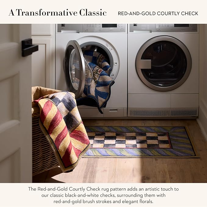 - ELEGANT FLOOR DECOR: The Red-and-Gold Courtly Check washable checkered rug features our iconic pattern and colorful borders in woven and printed polyester. This small rug can be cleaned in your home washing machine following the included instructions.
