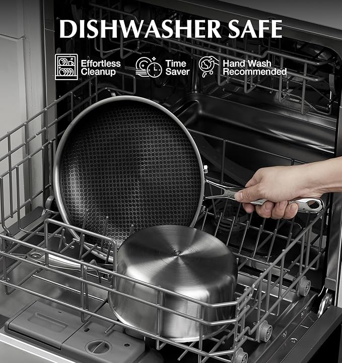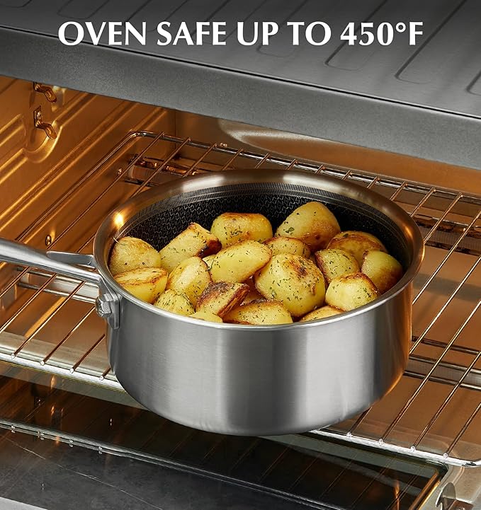 - Hybrid Honeycomb Interior: The innovative hybrid honeycomb design of stainless steel saucepan provides exceptional non-stick performance, allowing for easy cooking. Built for durability, it resists peeling and is safe for use with metal utensils, ensuring long-lasting reliability without compromising food quality.