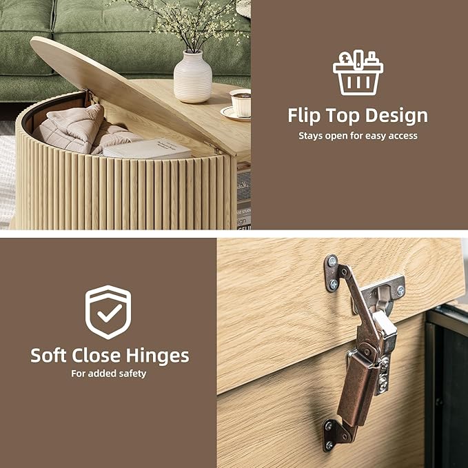 Round Coffee Table with Storage, Mid Century Modern Center Table with Sliding Cabinet Door, Fluted Dining Table for Living Room, Home Small Space, 31.5", Oak