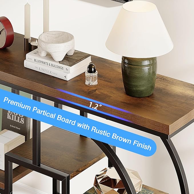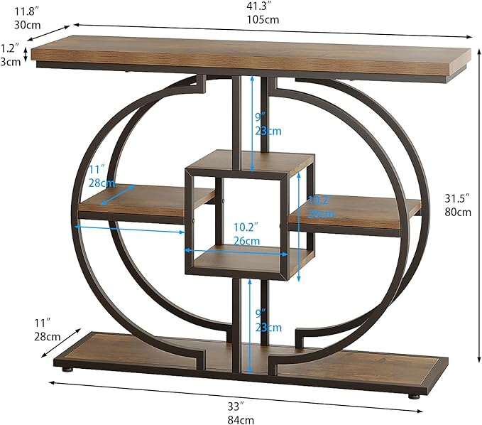- Elegant Geometric Design: The circular frame in the console table to let the original ordinary sofa table have a unique style. Rustic brown shelves mixed with a black metal frame creates a farmhouse and industrial style.Fill the console table with books, photos, plants, and decorations to make it an eye-catching addition to your home