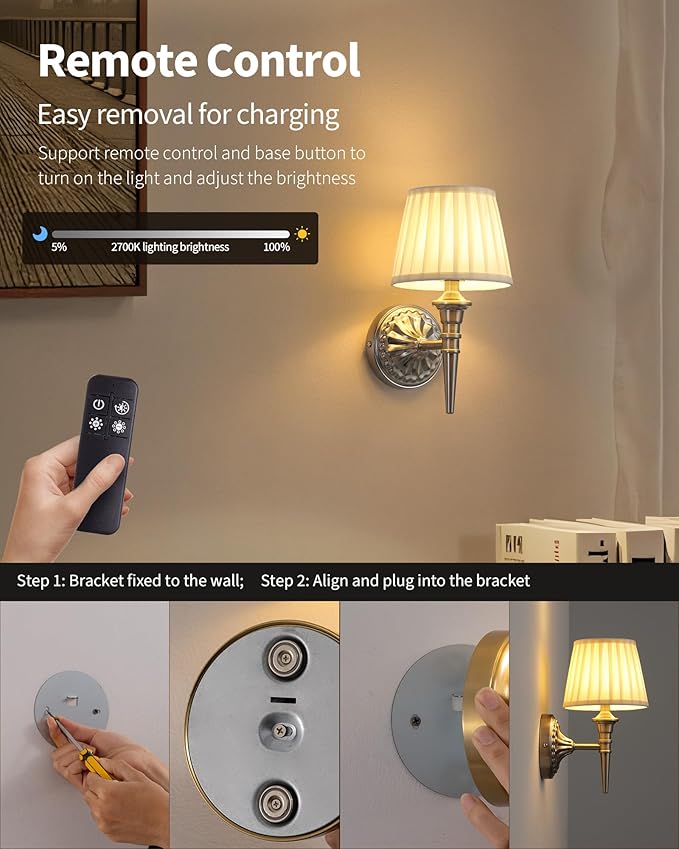 - Touch type stepless dimming: Dimmable wall sconce, touch sensitive button control on/off. Stepless dimming, according to your light needs, long press can adjust the brightness from 5% to 100%, you can also use the remote control included in the package. Remote control requires two AAA batteries (remote control batteries are not included in package)