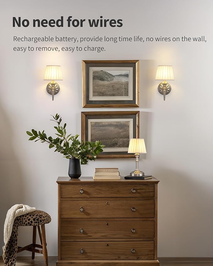 KDG Cordless Wall Sconces Set of 2, Small Wireless 5200mAh Rechargeable Battery Fabric LED Wall Lamps, Portables Lightings for Wall Painting, Living Room, Bedroom, Hallway, Gifts, Night Light (Nickel)