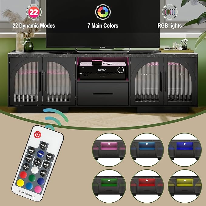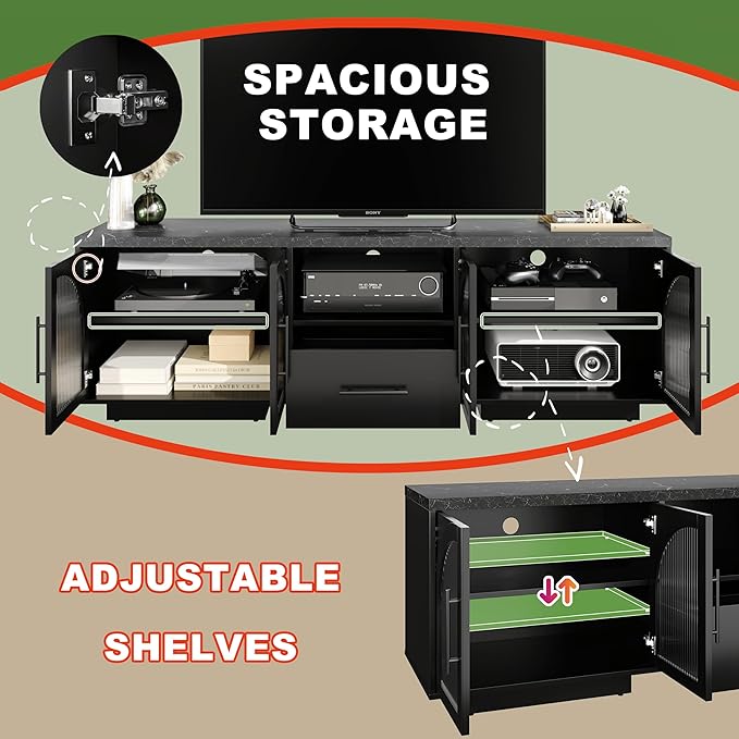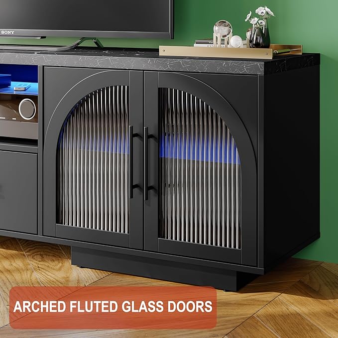 70" TV Stand for 80 Inch TVs, Entertainment Center with LED Lights and Arched Glass Doors, Faux Marble Wood Finish, Adjustable Shelves, Modern TV Cabinet for Living Room, Black