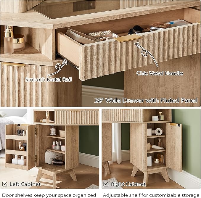 - Transform Your Space with Modern Elegance: Elevate your bedroom or dressing area with the T4TREAM Vanity, a sophisticated blend of modern style and functional design. Its corner-friendly structure and wave fluted panel combine with a natural oak texture to create an effortlessly chic aesthetic. Featuring a curved profile design, gold metal handles, a faux marble platform, and sturdy wooden splayed legs, this vanity is both a statement piece and a practical addition to your space.