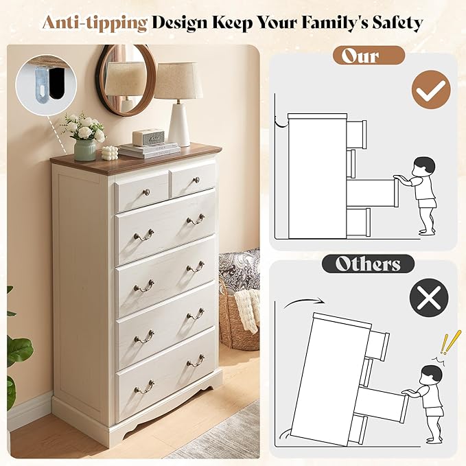 - 【Stable & Durable】Wooden wide desktop can hold up to 120 lbs. Unique thick base ensures excellent stability and sturdiness. Back of dresser organizer is equipped with anti-tipping device to protect your family