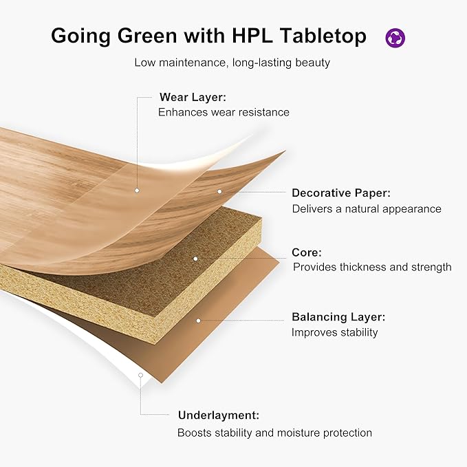 - Unique HPL Tabletop: Made from sustainable High Pressure Laminate material with a faux wood-grain design, free from any paint. Fade-proof and waterproof for long-term outdoor use.