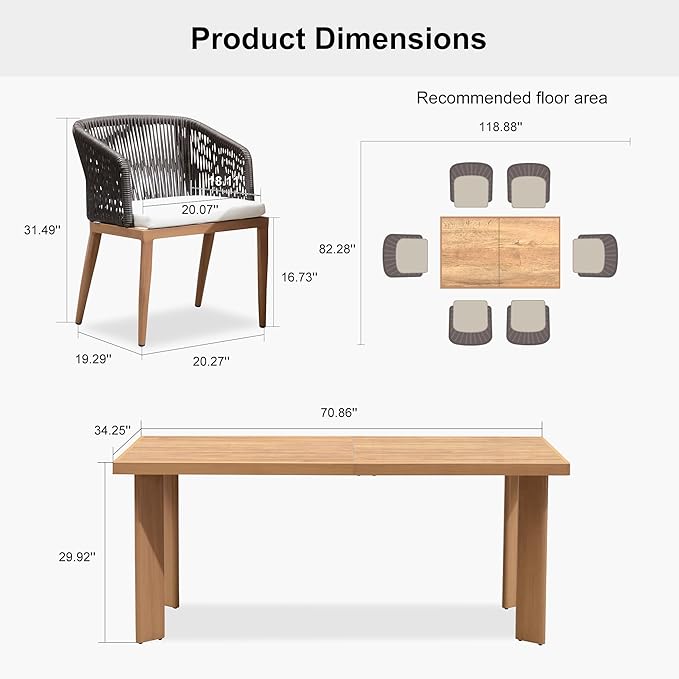 - Dining Set Dimensions: This patio dining table and chairs set includes 6 dining chairs and 1 rectangle table. Table size: 70.87"L x 34.25"W x 29.92"H. Chair size: 23.62"D x 22.44"W x 31.5"H. Chair capacity: 300lbs.