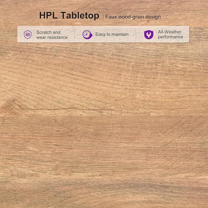 - Unique HPL Tabletop: Made from sustainable High Pressure Laminate material with a faux wood-grain design, free from any paint. Fade-proof and waterproof for long-term outdoor use.