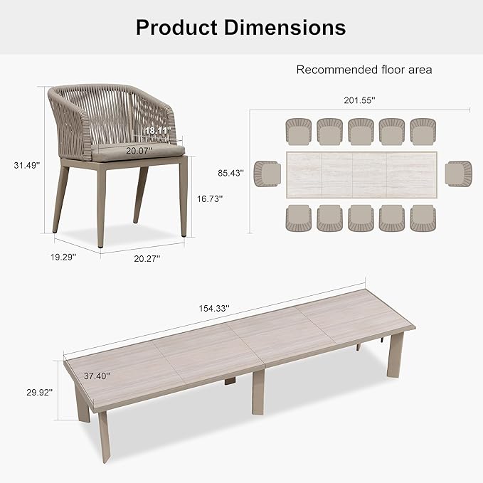 - Dining Set Dimensions: This patio dining table and chairs set includes 12 dining chairs and 1 rectangle table. Table size: 154.33"L x 37.4"W x 29.92"H. Chair size: 23.62"D x 22.44"W x 31.5"H. Chair capacity: 300lbs.