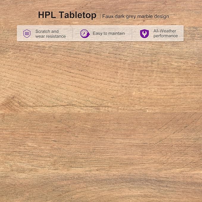 - Unique HPL Tabletop: Made from sustainable High Pressure Laminate material with a faux wood-grain design, free from any paint. Fade-proof and waterproof for long-term outdoor use.