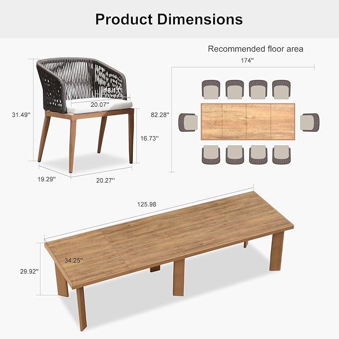 - Dining Set Dimensions: This patio dining table and chairs set includes 10 dining chairs and 1 rectangle table. Table size: 125.98"L x 34.25"W x 29.92"H. Chair size: 23.62"D x 22.44"W x 31.5"H. Chair capacity: 300lbs.
