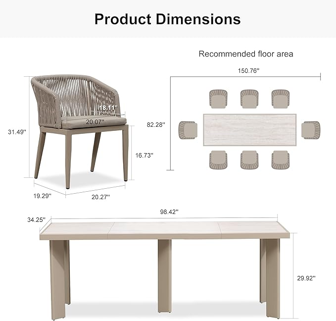 - Dining Set Dimensions: This patio dining table and chairs set includes 8 dining chairs and 1 rectangle table. Table size: 98.43"L x 34.25"W x 29.92"H. Chair size: 23.62"D x 22.44"W x 31.5"H. Chair capacity: 300lbs.