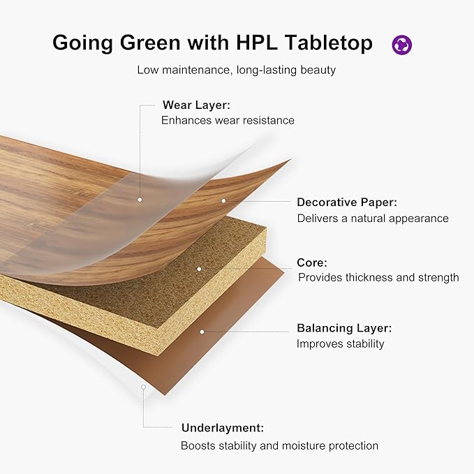 - Unique HPL Tabletop: Made from sustainable High Pressure Laminate material with a faux wood-grain design, free from any paint. Fade-proof and waterproof for long-term outdoor use.