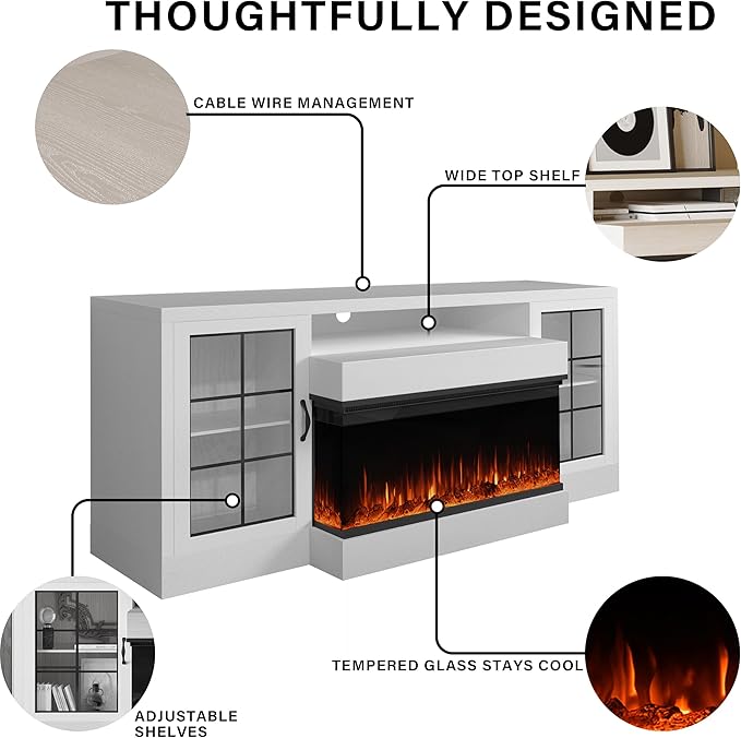 CharaVector 3-Sided Farmhouse Electric Fireplace TV Stand for TVs up to 75'', Entertainment Center with Glass Door Storage Cabinet, 60'' Large TV Stands with 30''Fireplace, White