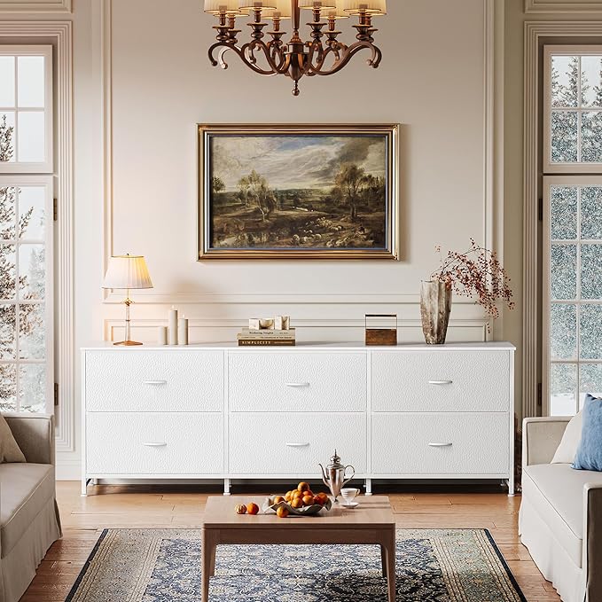 Huuger 63 Inch Long Dresser for Bedroom, Wide TV Stand for 55, 65, 70 Inch TV, 6 Drawer Dresser for Closet with Fabric Drawers, Storage Organizer for Bedroom, Entryway, PU Leather, White