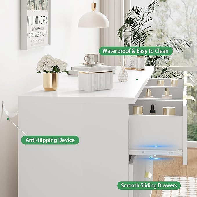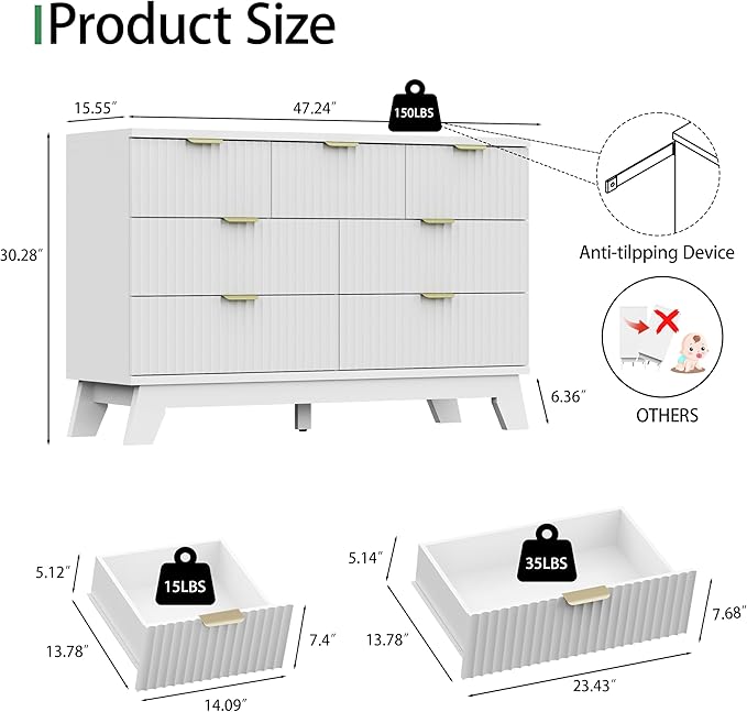 - 【Stability & Safety】The white/black/natural oak dresser is equipped with an anti-tipping device, which can be fixed on the wall to prevent accidents. Each drawer contains a wide metal handle and built-in slide rail, easy to push and pull. Besides, the sturdy base provides this dresser with drawers a strong support and the middle feet can be adjustable to keep balance on uneven floors
