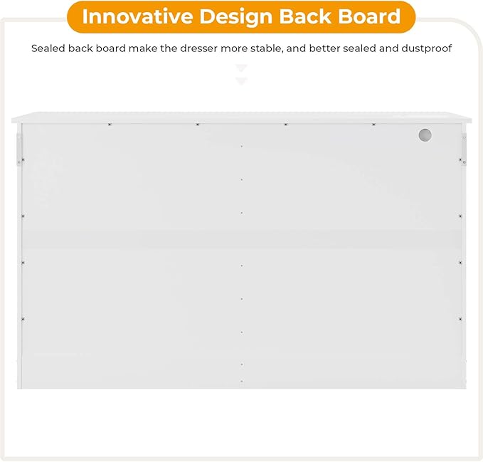 - 【Enclosed Backboard】 The innovatively designed back provides the dresser with better seal and dust resistance, as well as improved stability and resistance to swaying. A cable hole on each side ensures that plugs, light strips, or other media cables are well organized.