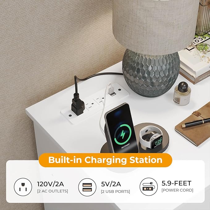- 【Built-in Charging Station】 The power strip is located on the desktop of the dresser, which has 2 AC outlets, 2 USB ports, and a power switch. It is very convenient for powering devices, such as TV, desk lamp, laptop, phone, etc.