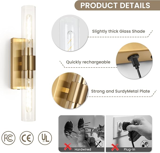 - 【Industrial Design】 Gold Wall Sconces design brings a modern atmosphere to your home. Metal lamp body with gold finishand and glass lampshade brings country style to your room. Stylish and minimalist, this not hardwired wall sconce is perfect for all modern interior scenes
