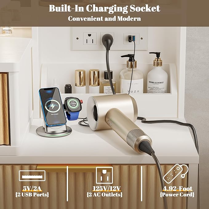 - 【32" HD Illuminated Mirror Makeup Application】Vanity desk with mirror and lights features 32" high-definition illuminated mirror, which guarantees perfect lighting for flawless makeup application. With customizable brightness levels and three lighting modes, it lets you create the ideal atmosphere for your beauty routine, whether it's for a daytime glow or an evening allure.