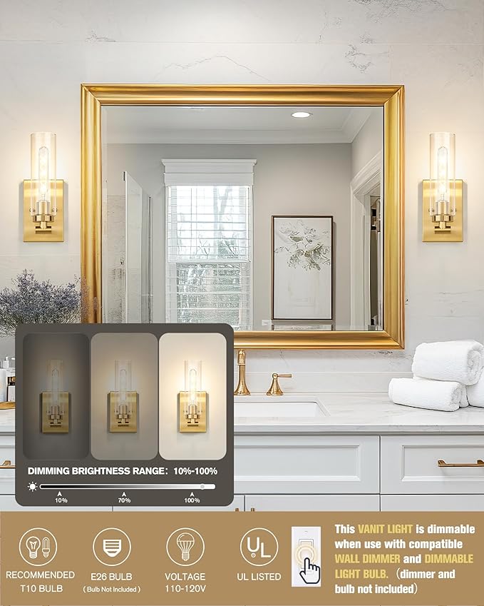 - [Dimension] Measuring 4.5"L x 4.9"W x 11.6"H, with a back plate size of 4.5"L x 0.8"W x 7.1"H, this gold bathroom light fixtures is hardwired (110-120V AC) and includes detailed instructions for quick, hassle-free installation. Enjoy a transformed space in just minutes.