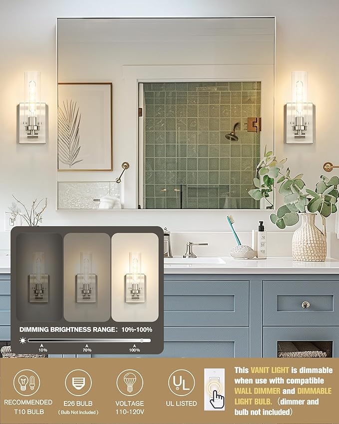 - [BULB REQUIREMENTS] This bathroom sconce supports versatile installation in either an upward or downward position. Designed for E26 base bulbs (60W max), it's fully dimmable when paired with dimmable bulbs and a compatible dimmer switch (bulbs and dimmer switch sold separately).