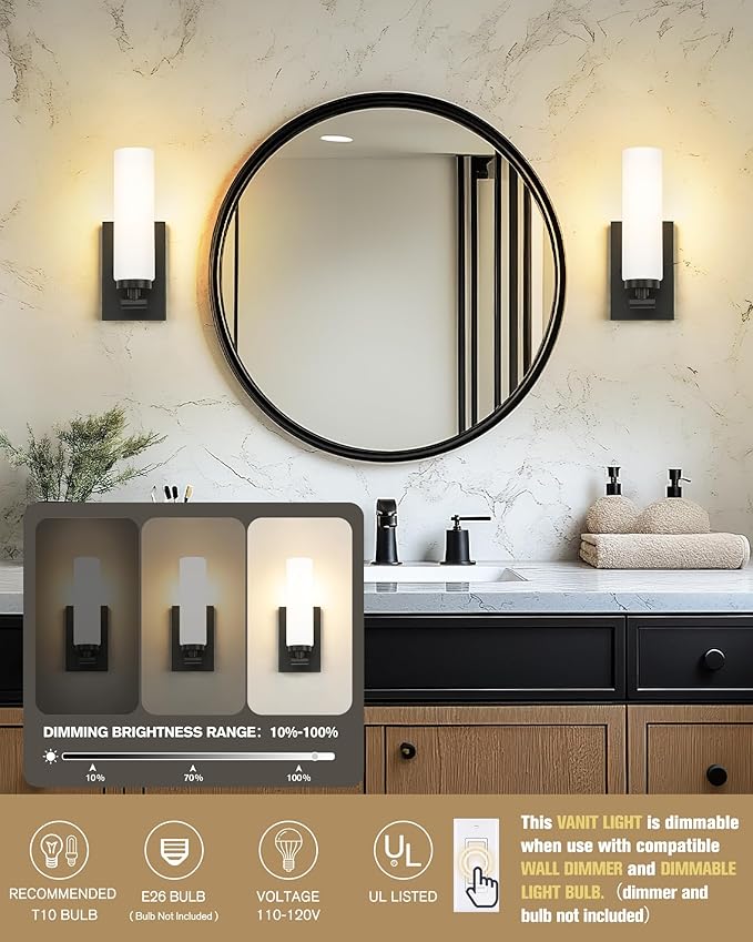 - [BULB REQUIREMENTS] This black wall sconce supports versatile installation in either an upward or downward position. Designed for E26 base bulbs (60W max), it's fully dimmable when paired with dimmable bulbs and a compatible dimmer switch (bulbs and dimmer switch sold separately).