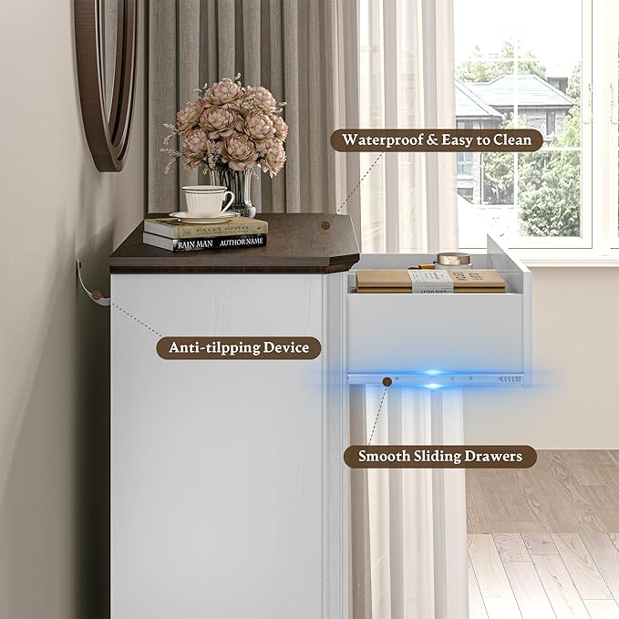 - 【Solid Material & Study Construction】The dressers & chests of drawers are constructed from optimal MDF, P2 engineered wood and coated metal handle which not only has exquisite texture, but also ensure long-term use, scratch resistant and no strong odor. Each drawer holds up to 35 lbs/ 15lbs and the thickened tabletop can support up to 150 lbs. For easy cleaning, just wipe with damp cloth and get it air-dried