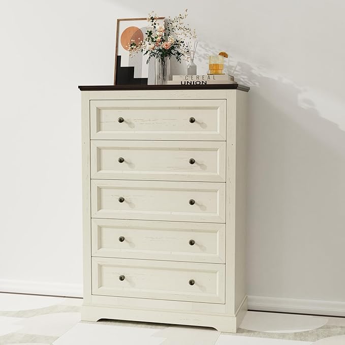 Farmhouse Dresser 5 Drawer, Bedroom Chest of Drawers, Dressers with 5 Drawers, Wooden Dressers for Bedroom, Living Room, Tv Stand, Entryway (Off White-5 Drawers)