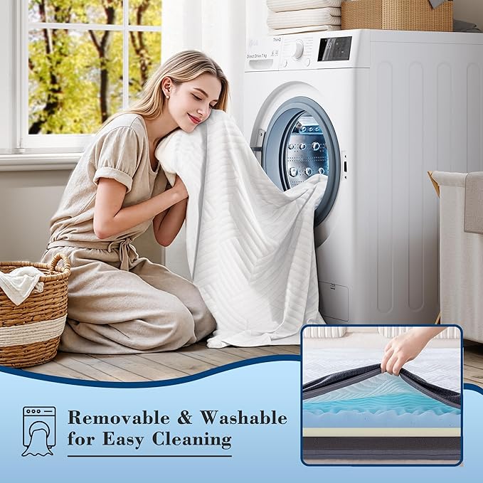- 【ANTI-Slip & Washable Cover】 Adjustable fixed belt + non-slip silicone point at the bottom of the cover to ensure that the matter topper is fixed on the bed, reducing the trouble of frequently adjusting the position of the mattress. The zipper encloses the entire foam, making it easy to remove and clean the mattress topper cover