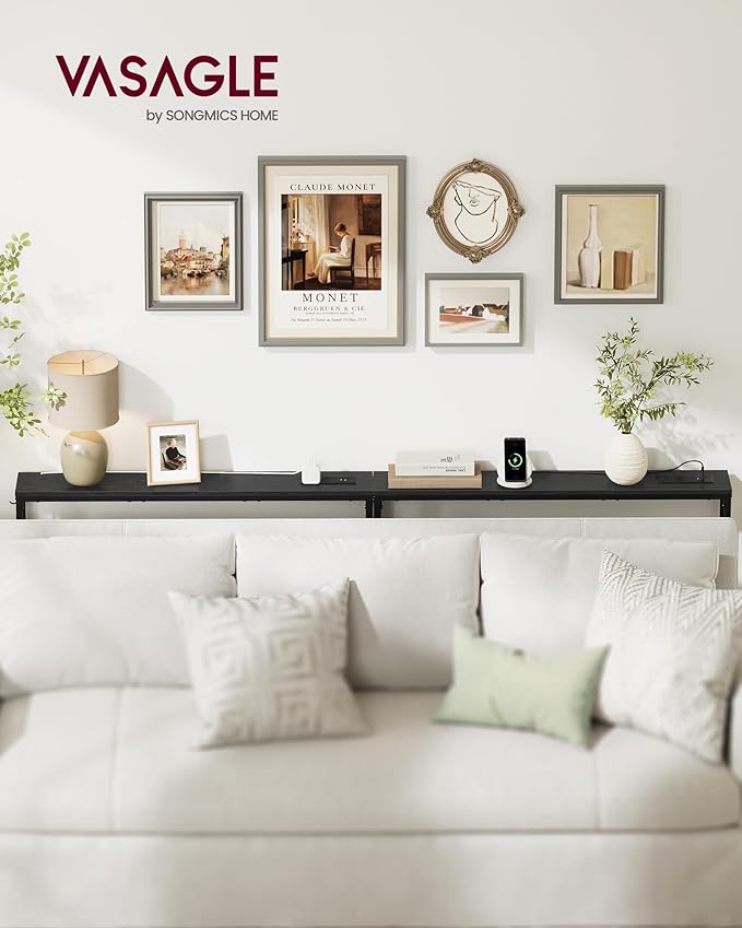 VASAGLE Set of 2 Console Tables with Power Outlets, Slim Behind Couch Sofa Tables, 5.9 x 39.4 x 31.5 Inches, 2 Hooks, Easy Assembly, for Entryway, Living Room, Ebony Black and Ink Black ULNT078B01