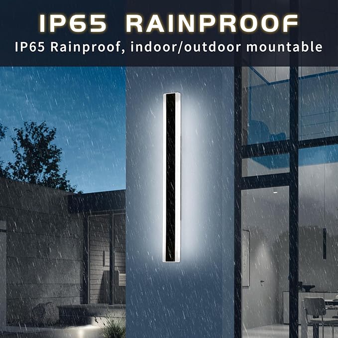 - IP65 OUTDOOR WALL SCONCE SPECIFICATIONS: 6000K Rectangular modern exterior lighting fixtures power is 28W, using 6000K cool white LED chips. Size is 31.4*2.36*1.37 inches, 23.6/31.4/39/47.2/57 inches available, designed for outdoor use with short circuit protection. It can withstand the wind and rain, with an operating temperature range of -15°C to +45°C. The lumen is about2520