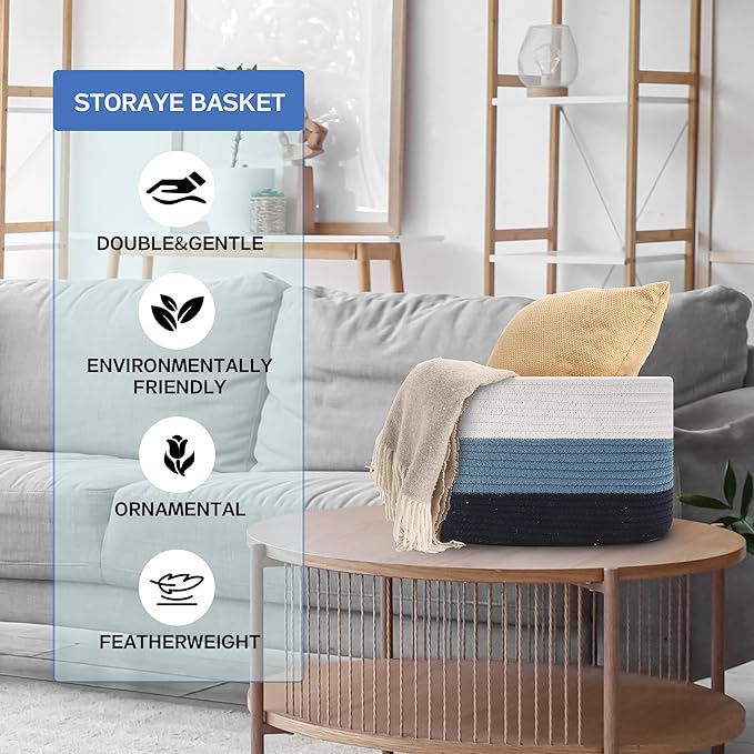 4 Pack Woven Storage Baskets for Organizing - Cotton Rope Baskets for Closet, Toys, Books, Towels, Durable Storage Bins for Shelves, Living Room, Bedroom, 14.76''Lx9.84''Wx8.86''H (Blue, 13")