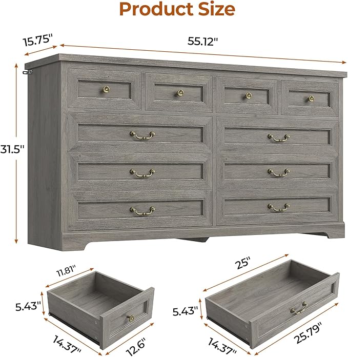 - 【SATISFACTORY STORAGE CAPACITY】Measuring 55.1" W x 32.3" H x 15.8" D, this dresser features 6 large and 4 small drawers, providing ample storage space for socks, clothes, sheets, cozy blankets, or pillows. Each drawer is 4.7" deep, easily accommodating any adult clothing or comforter. Its spacious tabletop allows for picture frames, art decor, and more.