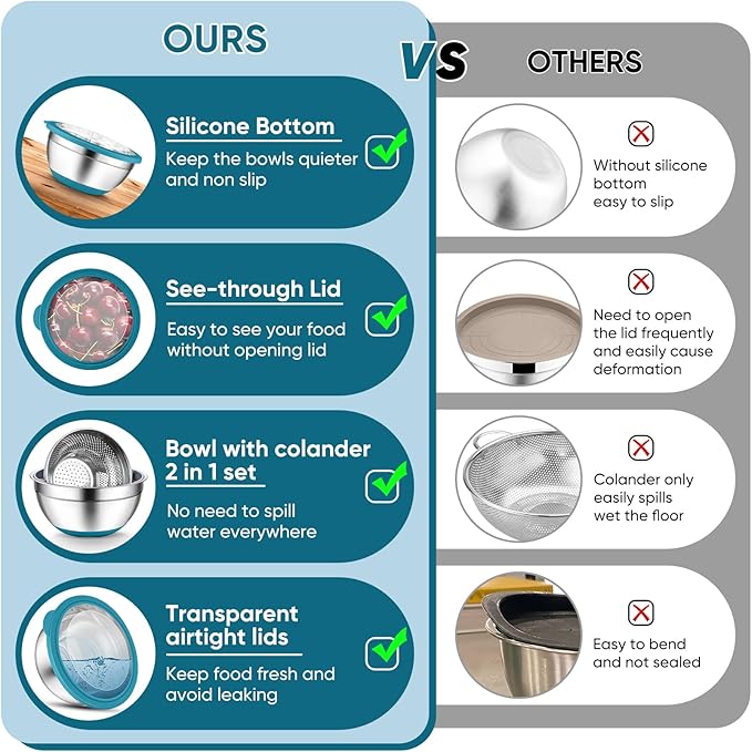 - 【Upgrade Airtight Clear Lid】Each metal mixing bowl features a see through lid that allows you to easily see the contents without needing to open it, The lid silicone side is completely wrapped around the bowl and not warp easily, Ensuring food stays fresh while preventing spills, Additionally, The smooth rolled edges provide a comfortable grip, And its blue color can complement various kitchen styles, This combination of functionality and design makes it a nice addition to your kitchen
