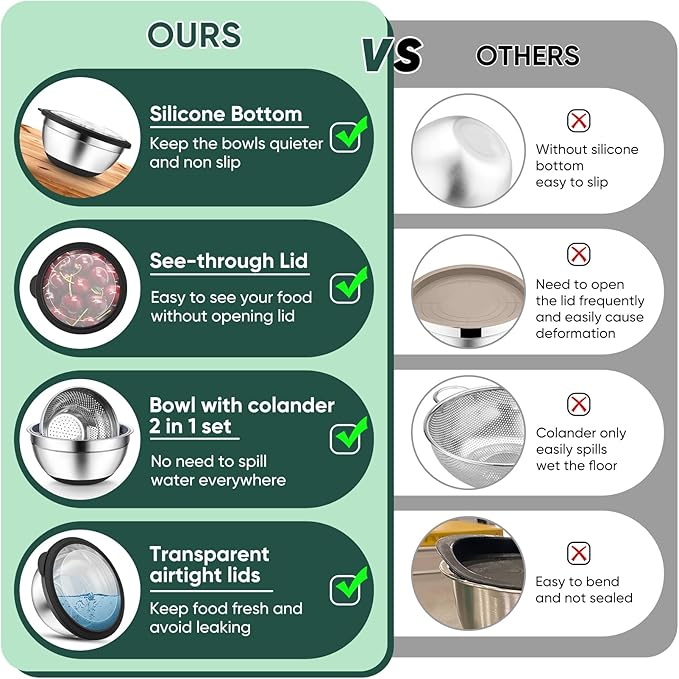 - 【Premium Material】P&P CHEF mixing bowls and colander are made of premium stainless steel, Lids are made of food-grade plastic and silicone, No worries about any toxic materials into your food, The bottom design with silicone prevents the bowl from slipping or making noise, Stainless steel mixing bowls are more anti-deformation and not easy to crack, Ensuring the durability of the bowls, Longevity and satisfy with your cooking and baking needs
