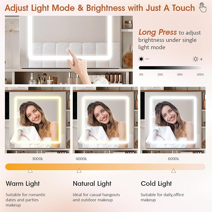 - Vanity Desk with LED Lighted Mirror:The LED Lighted Mirror With 3 modes (warm,natural,and cold),adjust the brightness according to different scenes. which can provide a perfect atmosphere for your daily skin care/makeup/styling and help you create a perfect and exquisite makeup.